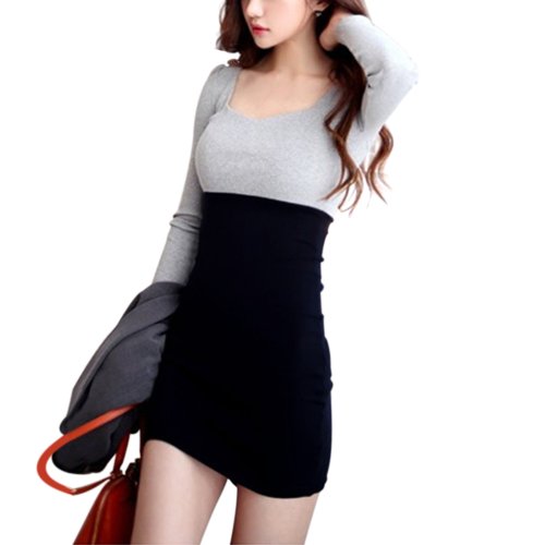 Abody Korean Style Ladies Slim Gown Puff Contrast Patchwork Scoop Neck Costume